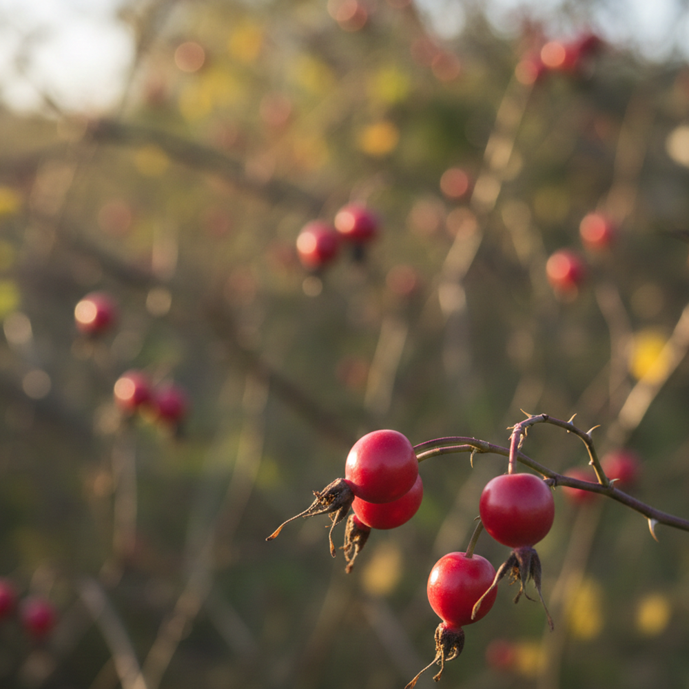 Die Hagebutte ist die Frucht der Hundsrose – einer urwüchsigen, widerstandsfähigen Wildpflanze. Ihre Wurzeln reichen tief in die Erde, ihre Zweige trotzen Wind und Frost. Sie steht für Anpassungsfähigkeit, Lebenskraft und die Fähigkeit, aus Dornen Schönheit hervorzubringen.